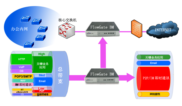 在带宽管理方面,配合用户自定义的带宽策略以及 FlowGate 的核心带宽自动分配算法,可以为网络链路划分多个虚拟带宽通道,能够实现最大带宽限制、保证带宽、带宽租借、应用优先级、 Per-IP 带宽控制、 Per-Net 带宽控制、随机公平队列等一系列带宽管理功能,为客户提供带宽管理、分析和优化的一体化解决方案,能够有效的检测和防止不正常应用对网络带宽资源的非正常消耗,保证关键应用带宽,限制非业务应用带宽,改善和保障了整体网络应用的服务质量。